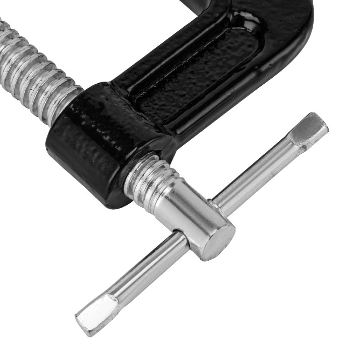 G-образная струбцина Sparta 206535 с шириной зажима 75 мм надежно фиксирует различные детали для дальнейшего склеивания, сверления, пиления, шлифования или сварки. Винт с воротком и крупной червячной резьбой позволяет за...