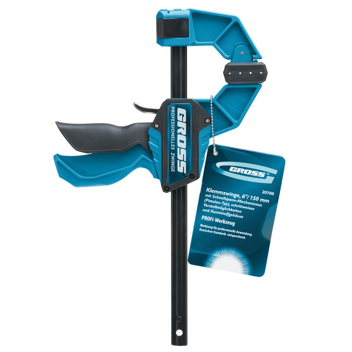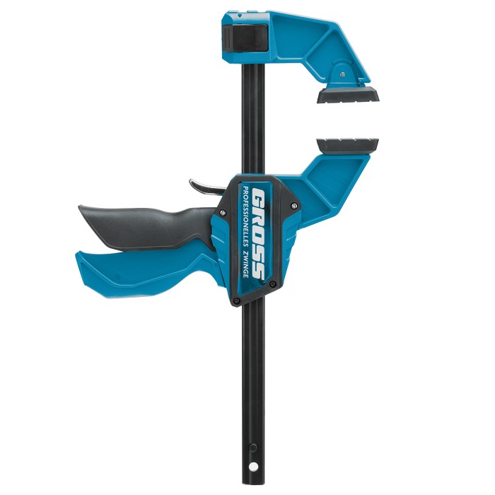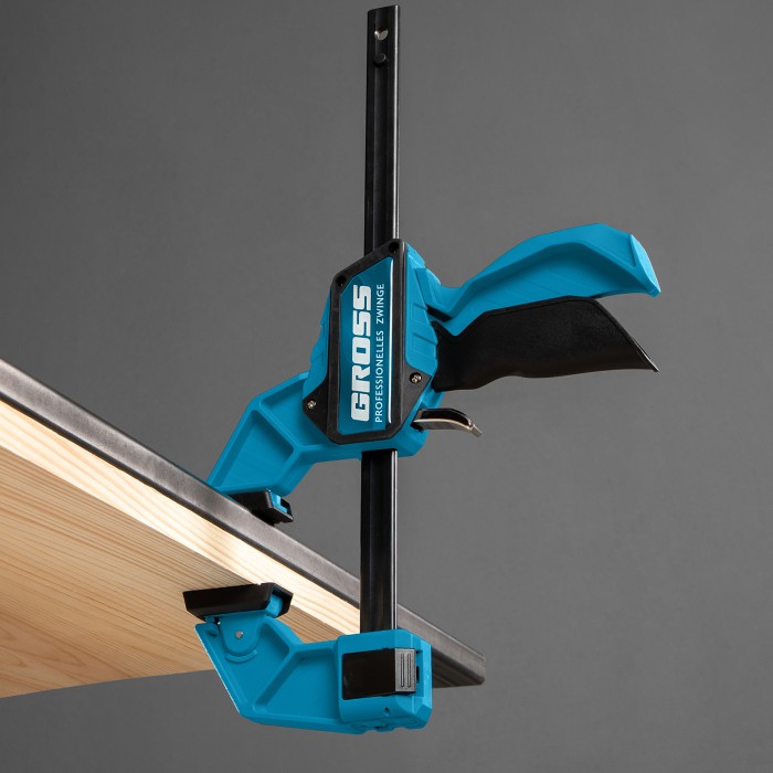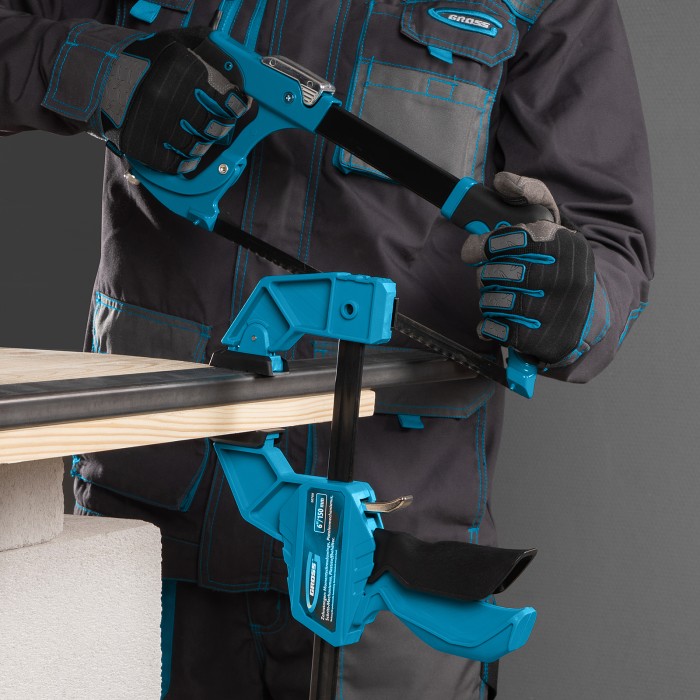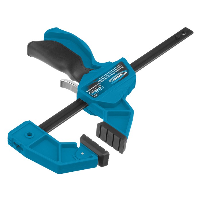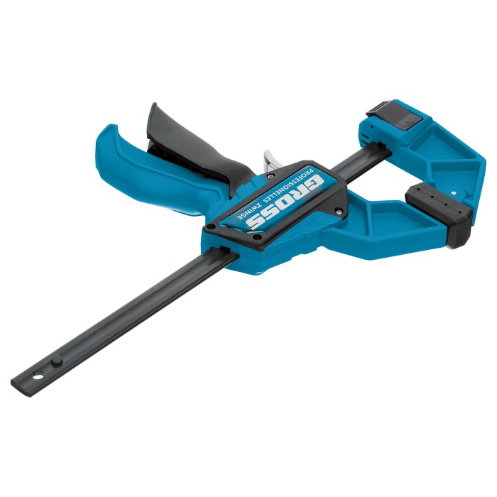 Реечная быстрозажимная струбцина Gross 20700 пистолетного типа, с пластиковым корпусом, с шириной зажима 150 мм, с пошаговым механизмом, используется для зажимания заготовок при выполнении столярных или монтажных работ. ...