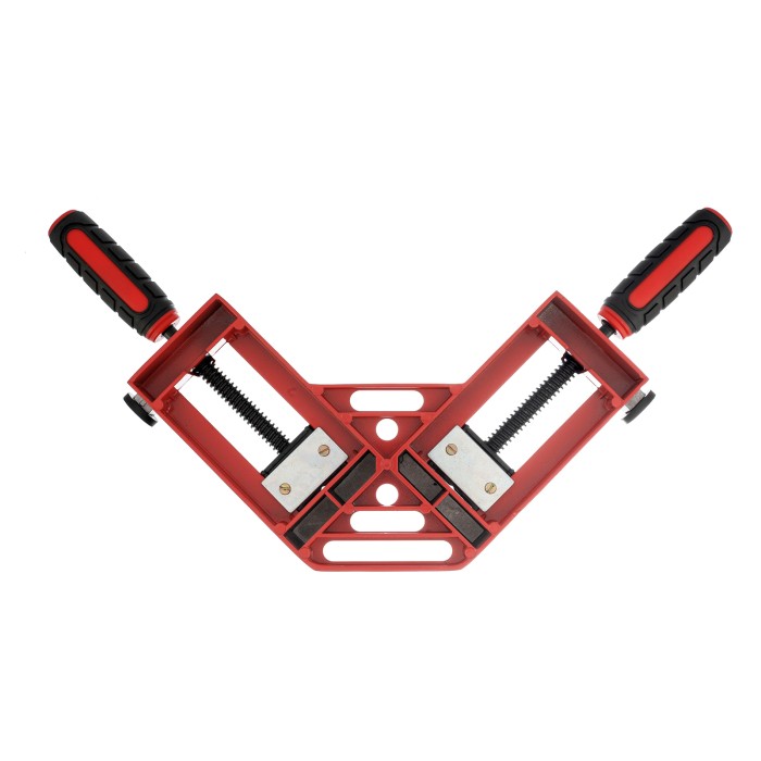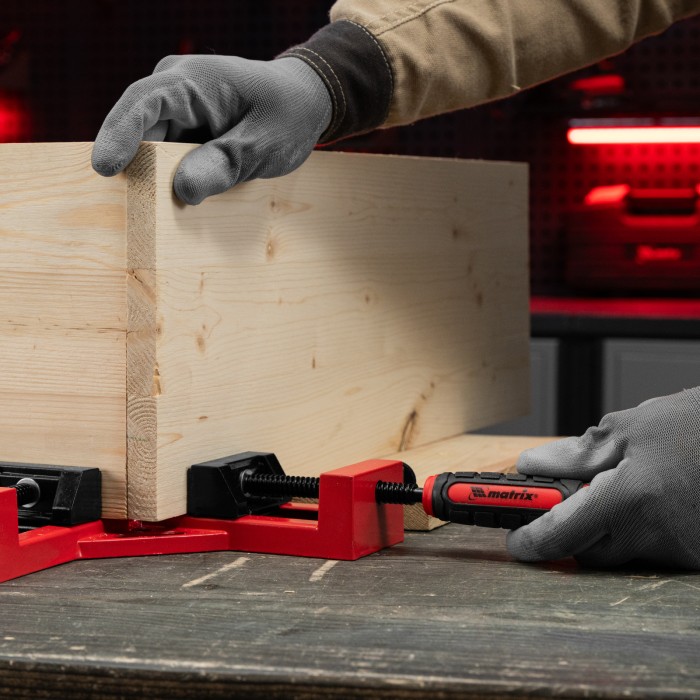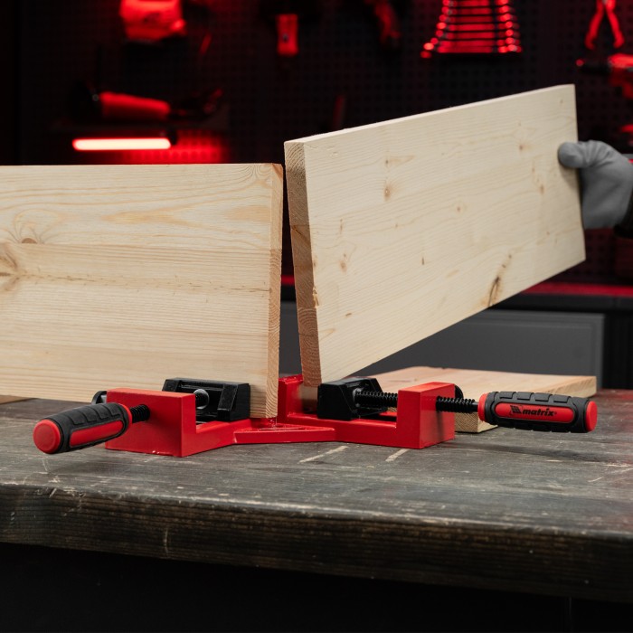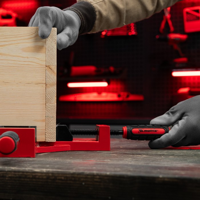 Угловая быстрозажимная струбцина Matrix 20322 с шириной зажима 65 х 65 мм, с двухкомпонентными обрезиненными рукоятками, предназначена для быстрой и надежной фиксации заготовок перпендикулярно друг другу. Рычажно-осевой механизм не требует особых усилий от пользователя. Инструмент позволяет точно выдерживать угол в 90°, обеспечивая высокое качество работ. Струбцину используют для сборки мебели и других конструкций.ПреимуществаНадежность — рама изготовлена из прочного алюминиевого сплава.Возможность крепления на верстаке — в корпусе имеются специальные отверстия и пазы.Комфортная работа — двухкомпонентные рукоятки с прорезиненной рельефной поверхностью не выскальзывают из рук.