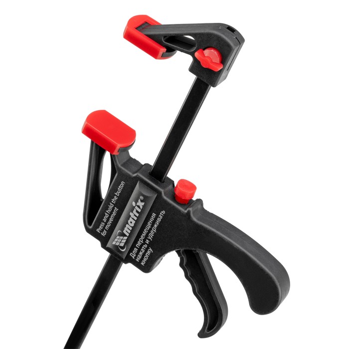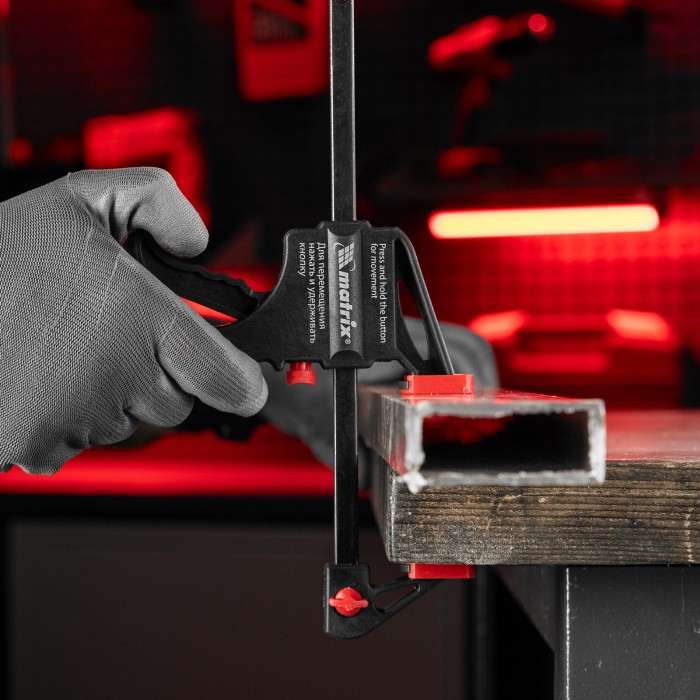Универсальная F-образная быстрозажимная струбцина Matrix 20561 размером 150 х 265 х 45 мм, в пластиковом корпусе, используется в столярном деле. Позволяет быстро фиксировать заготовки с целью их соединения или обработки — склеивания, сверления, шлифовки, пиления и других видов работ. Подвижная губка перемещается вдоль штанги при помощи пластинчатого механизма, а фиксатор препятствует разжиманию струбцины. Массивная конструкция обеспечивает надежность инструмента.ПреимуществаУстойчивость к нагрузкам — стальная направляющая выдерживает значительные усилия при сжатии предметов.Высокий ресурс — рабочие элементы из ударопрочного пластика обладают высокой механической стойкостью.Аккуратная работа — защитные накладки на губках предохраняют зажимаемые детали от повреждений.Дополнительные возможности — опорную губку можно установить на противоположный конец штанги, после чего использовать струбцину на разжим.