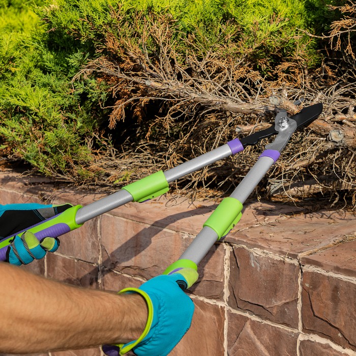 Сучкорез прямого реза Palisad 60595 с телескопическими стальными обрезиненными рукоятками, регулирующимися в пределах 550-710 мм, — инструмент для срезания живых веток толщиной до 35 мм. Сучкорез с длинными ручками предн...