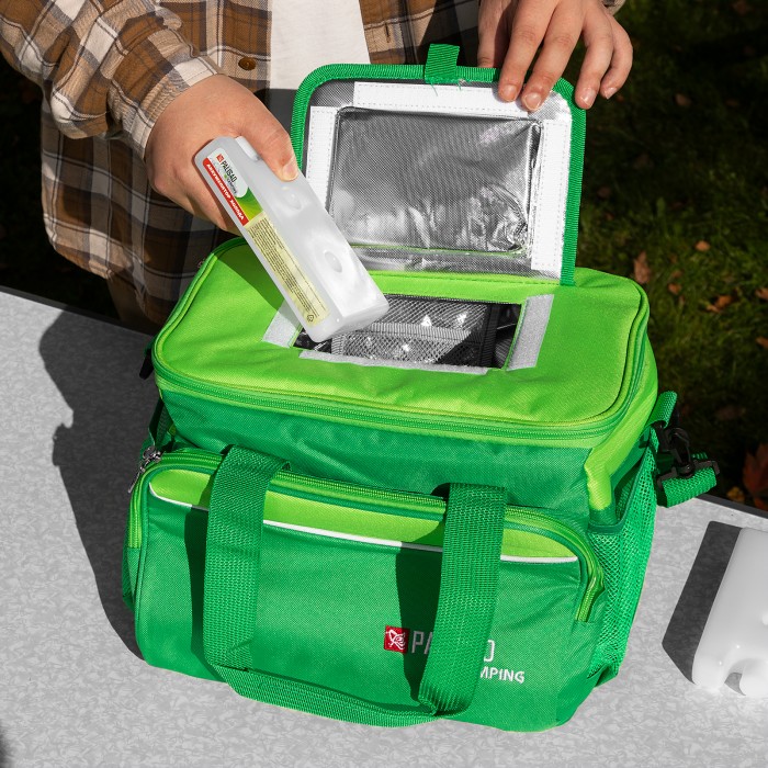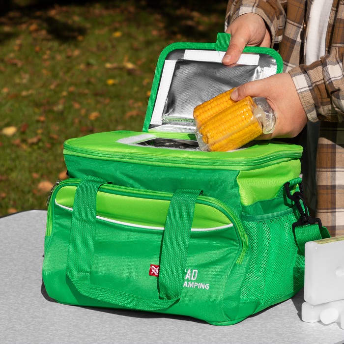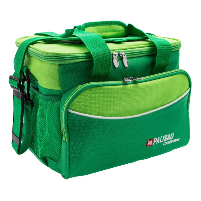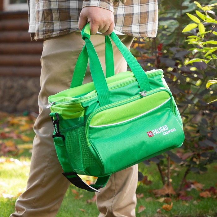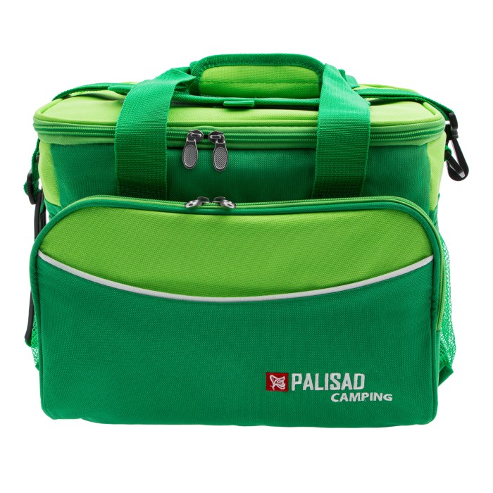 Сумка-холодильник Palisad Camping 69597 габаритами 32 х 25 х 24 см комплектуется двумя охлаждающими блоками и способна в течение нескольких часов сохранять продукты и напитки прохладными, поэтому будет полезна в поездке или на пикнике. Для максимального охлаждения следует перед использованием минимум 6 часов выдержать блоки в морозильной камере. Внутри сумки-холодильника имеются сетчатые кармашки для аккумуляторов холода. Сумку без охлаждающих блоков можно использовать для поддержания температуры горячих блюд и напитков. Регулируемый ремень позволяет носить сумку на плече.ПреимуществаДолговечность — наружная поверхность из полиэстера плотностью 600D устойчива к износу.Эффективное сохранение температуры — эту функцию выполняет теплоизоляционный слой из алюминиевой фольги и EPE.Минимальные потери холода (или тепла) — для доступа к содержимому предусмотрен верхний люк.Дополнительные возможности — внутрь вместительного бокового кармана можно положить столовые приборы.