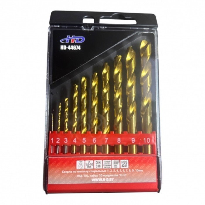Сверла по металлу спиральные 1, 2, 3, 4, 5, 6, 7, 8, 9, 10мм HSS-TiN, набор 10 предметов "H-D"