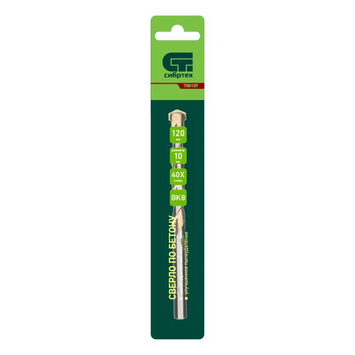 Сверло по бетону Сибртех 708107 диаметром 10 мм и длиной 120 мм, с цилиндрическим хвостовиком и улучшенным пылеудалением, предназначено для сверления в ударном режиме бетона и кирпича. Пригодится во время строительных и ремонтных работ.ПреимуществаПрочность — сверло изготовлено из стали 40Х, легированной хромом, поэтому устойчиво к динамическим нагрузкам. Эффективная работа с твердыми материалами — остро заточенная режущая пластина изготовлена из сплава карбида вольфрама твердостью 80-90 HRC.Долговечность — специальная канавка способствует ускоренному отведению шлама, что обеспечивает защиту сверла от перегрева.