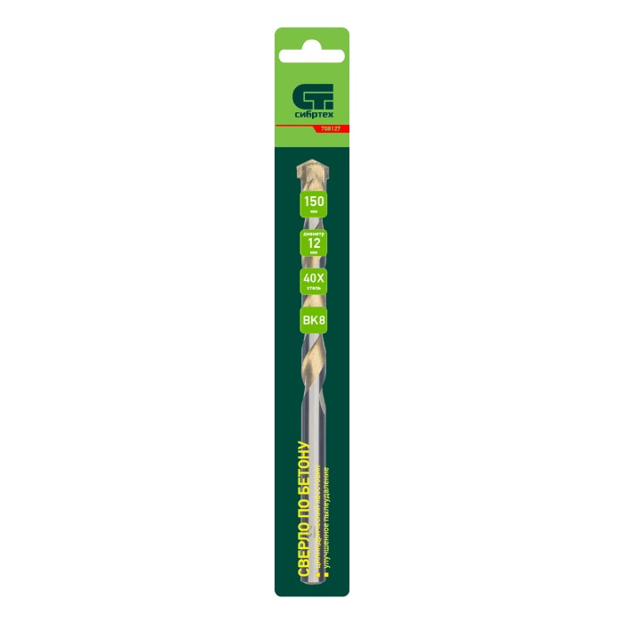 Сверло по бетону Сибртех 708127 диаметром 12 мм и длиной 150 мм, с цилиндрическим хвостовиком и улучшенным пылеудалением, предназначено для сверления в ударном режиме бетона и кирпича. Пригодится во время строительных и ремонтных работ.ПреимуществаПрочность — сверло изготовлено из стали 40Х, легированной хромом, поэтому устойчиво к динамическим нагрузкам. Эффективная работа с твердыми материалами — остро заточенная режущая пластина изготовлена из сплава карбида вольфрама твердостью 80-90 HRC.Долговечность — специальная канавка способствует ускоренному отведению шлама, что обеспечивает защиту сверла от перегрева.