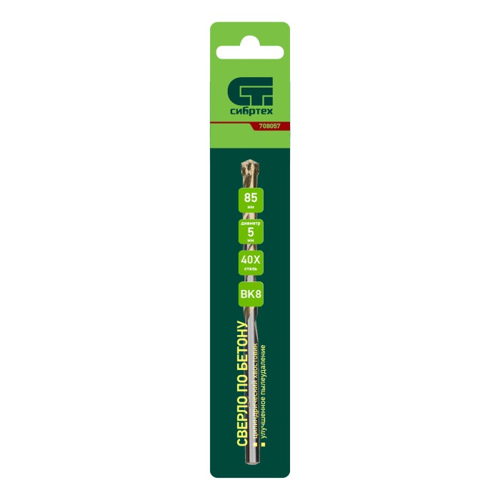 Сверло по бетону Сибртех 708057 диаметром 5 мм и длиной 85 мм, с цилиндрическим хвостовиком и улучшенным пылеудалением, предназначено для сверления в ударном режиме бетона и кирпича. Пригодится во время строительных и ремонтных работ.ПреимуществаПрочность — сверло изготовлено из стали 40Х, легированной хромом, поэтому устойчиво к динамическим нагрузкам. Эффективная работа с твердыми материалами — остро заточенная режущая пластина изготовлена из сплава карбида вольфрама твердостью 80-90 HRC.Долговечность — специальная канавка способствует ускоренному отведению шлама, что обеспечивает защиту сверла от перегрева.