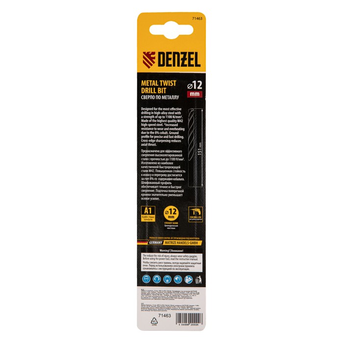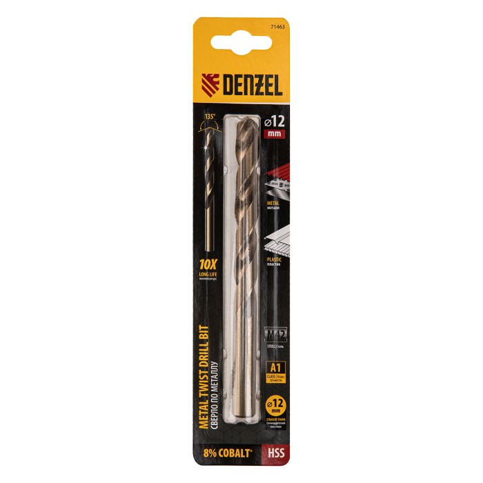 Кобальтовое сверло по металлу Denzel 71463 диаметром 12 мм, из стали HSS Co-8%, позволяет получать отверстия высокой точности в нержавеющей стали, цветных металлах, легированных и нелегированных сталях с пределом прочнос...