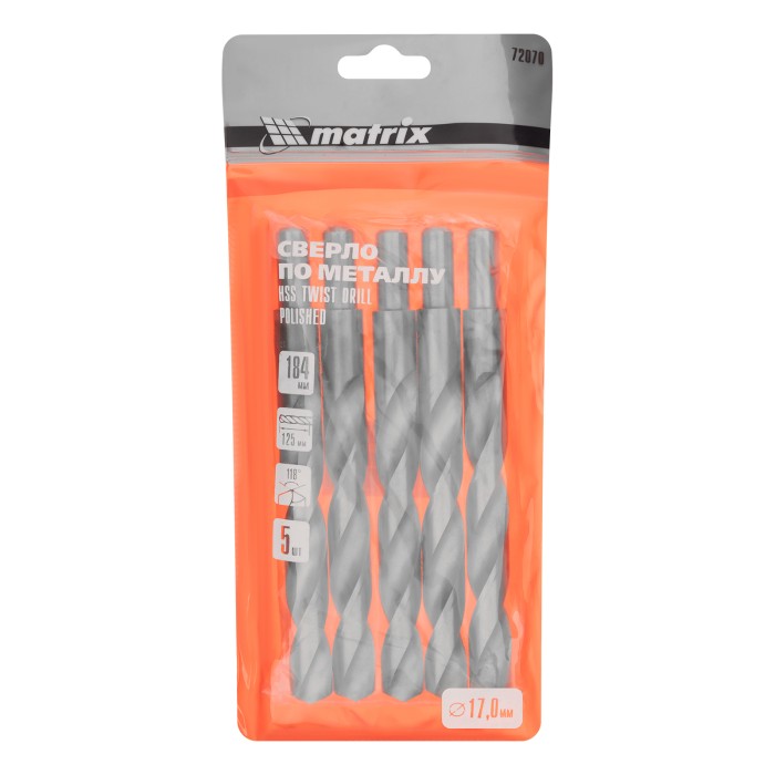Сверло по металлу, 17 мм, полированное, HSS, 5 шт, цилиндрический хвостовик Matrix