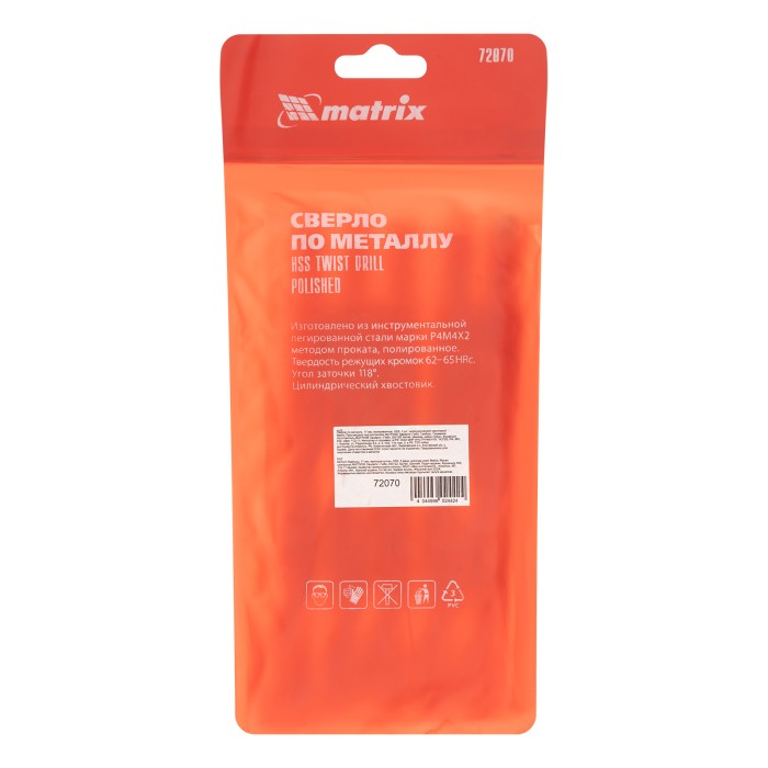 Полированное сверло по металлу Matrix 72070 из стали HSS, с цилиндрическим хвостовиком, 5 шт. в упаковке, используется для получения отверстий диаметром 17 мм. Угол заточки составляет 118°, поэтому сверло оптимально для работы с черными металлами, сталью, чугуном и твердой бронзой.ПреимуществаПрочность и высокий ресурс — оснастка выполнена из быстрорежущей стали HSS, режущие кромки закалены до твердости 62-65 HRC.Эффективная работа — полированная поверхность снижает трение сверла о стенки отверстия и улучшает отвод стружки, а ленточки на канавках выполняют функцию дополнительных режущих элементов.Продуманная конструкция — диаметр рабочей части уменьшается по направлению к хвостовику, что снижает трение и предотвращает застревание сверла.Универсальность — цилиндрический хвостовик подходит к патронам любого типа.Удобная комплектация — в упаковке 5 сверл, которых хватит для выполнения большого объема работ.