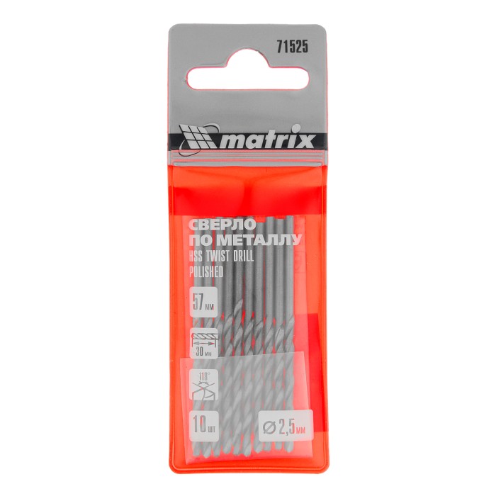 Сверло по металлу, 2.5 мм, полированное, HSS, 10 шт, цилиндрический хвостовик Matrix