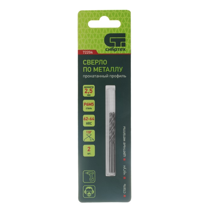 Сверло по металлу Сибртех 72204 диаметром 2,5 мм, 2 шт. в упаковке, имеет угол заточки 118°, оптимальный для получения отверстий в черных и тяжелых металлах, в том числе стали, чугуне и твердой бронзе. Отличается наиболе...