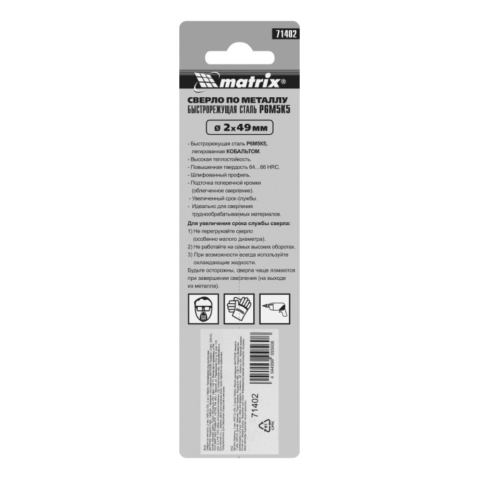 Сверло Matrix 71402 диаметром 2 мм, из стали HSS Co-5%, 2 штуки в комплекте, имеет угол заточки 135°, оптимальный для сверления легированных и цветных металлов. Подходит для профессионального использования на строительно...