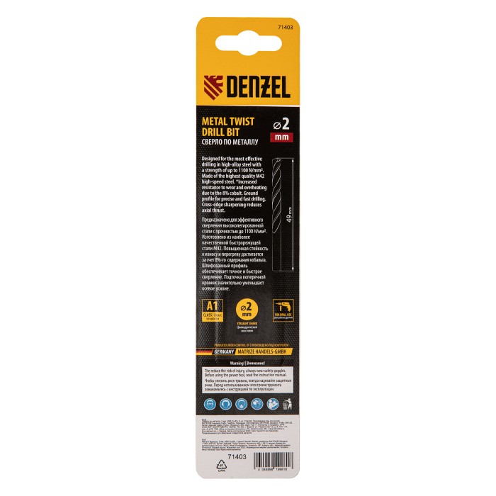 Кобальтовое сверло по металлу Denzel 71403 диаметром 2 мм, из стали HSS Co-8%, 2 шт. в упаковке, позволяет получать отверстия высокой точности в нержавеющей стали, цветных металлах, легированных и нелегированных сталях с...