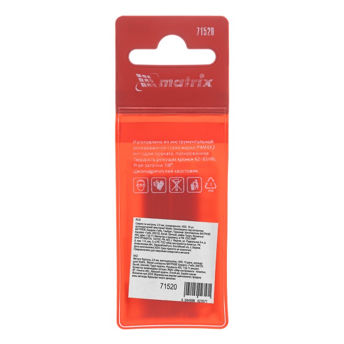 Полированное сверло по металлу Matrix 71520 из стали HSS, с цилиндрическим хвостовиком, 10 шт. в упаковке, используется для получения отверстий диаметром 2,0 мм. Угол заточки составляет 118 градусов, поэтому сверло оптимально для работы с черными металлами, сталью, чугуном и твердой бронзой.ПреимуществаПрочность и высокий ресурс — оснастка выполнена из быстрорежущей стали HSS, режущие кромки закалены до твердости 62-65 HRC.Эффективная работа — полированная поверхность снижает трение сверла о стенки отверстия и улучшает отвод стружки, а ленточки на канавках выполняют функцию дополнительных режущих элементов.Продуманная конструкция — диаметр рабочей части уменьшается по направлению к хвостовику, что снижает трение и предотвращает застревание сверла.Универсальность — цилиндрический хвостовик подходит к патронам любого типа.Удобная комплектация — в упаковке 10 сверл, которых хватит для выполнения большого объема работ.