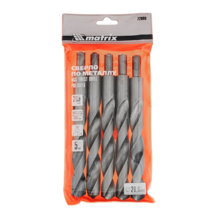 Сверло по металлу, 20 мм, полированное, HSS, 5 шт, цилиндрический хвостовик Matrix