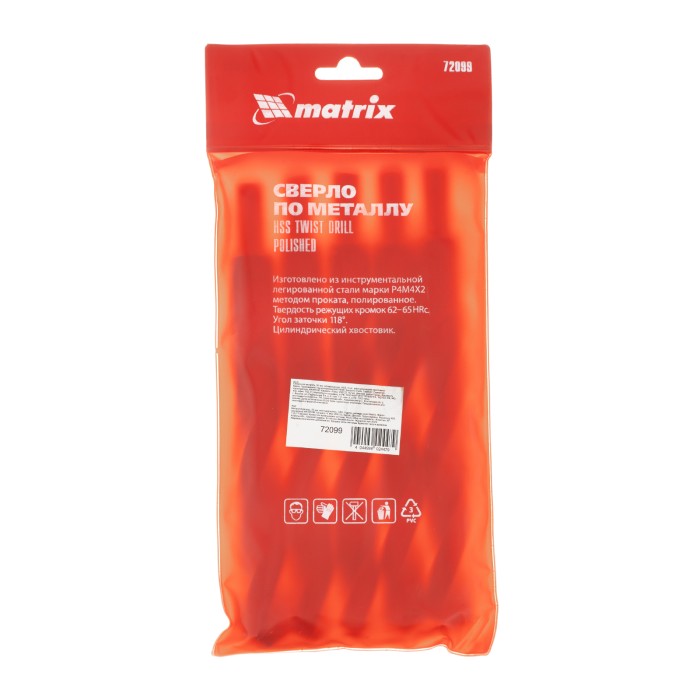 Полированное сверло по металлу Matrix 72099 из стали HSS, с цилиндрическим хвостовиком, 5 шт. в упаковке, используется для получения отверстий диаметром 20 мм. Угол заточки составляет 118°, поэтому сверло оптимально для работы с черными металлами, сталью, чугуном и твердой бронзой.ПреимуществаПрочность и высокий ресурс — оснастка выполнена из быстрорежущей стали HSS, режущие кромки закалены до твердости 62-65 HRC.Эффективная работа — полированная поверхность снижает трение сверла о стенки отверстия и улучшает отвод стружки, а ленточки на канавках выполняют функцию дополнительных режущих элементов.Продуманная конструкция — диаметр рабочей части уменьшается по направлению к хвостовику, что снижает трение и предотвращает застревание сверла.Универсальность — цилиндрический хвостовик подходит к патронам любого типа.Удобная комплектация — в упаковке 5 сверл, которых хватит для выполнения большого объема работ.
