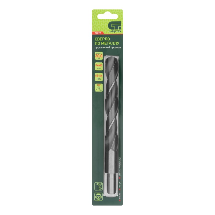 Сверло по металлу Сибртех 72299 диаметром 20,0 мм, имеет угол заточки 118°, оптимальный для получения отверстий в черных и тяжелых металлах, в том числе стали, чугуне и твердой бронзе. Отличается наиболее выгодной стоимо...