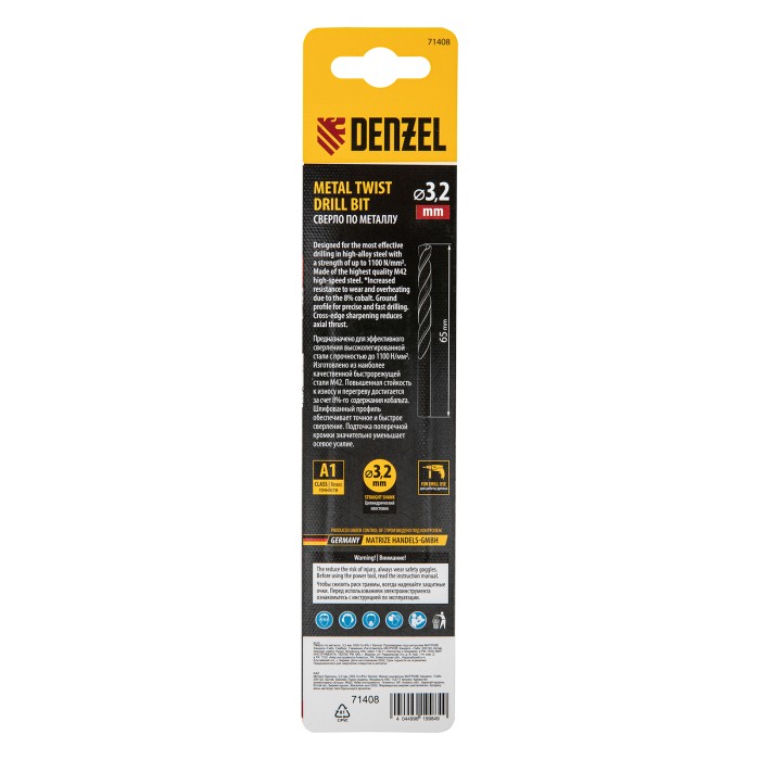 Кобальтовое сверло по металлу Denzel 71408 диаметром 3,2 мм, из стали HSS Co-8%, позволяет получать отверстия высокой точности в нержавеющей стали, цветных металлах, легированных и нелегированных сталях с пределом прочно...