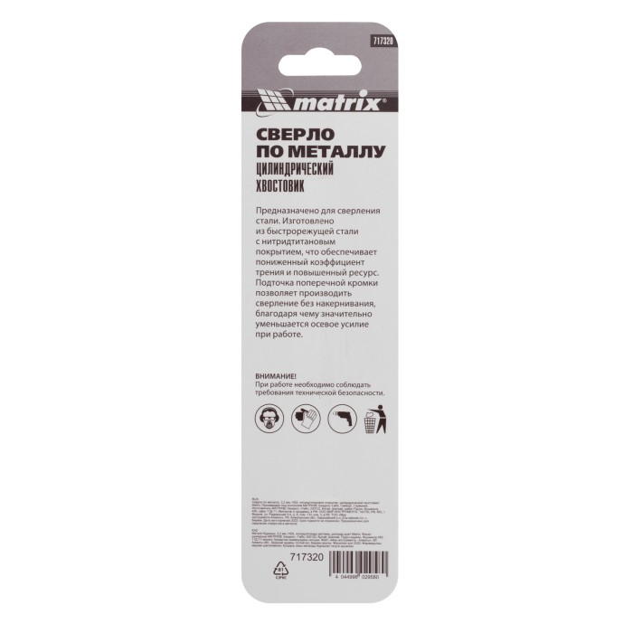 Сверло Matrix 717320 диаметром 3,2 мм, из стали HSS, с нитридтитановым покрытием и цилиндрическим хвостовиком, предназначено для получения отверстий в металле. Угол заточки 118° оптимален для работы с черными металлами, сталью, чугуном и твердой бронзой. Сверло выдерживает интенсивные нагрузки и подходит для профессионального использования.ПреимуществаНадежность — сверло изготовлено из универсальной быстрорежущей стали HSS, нитридтитановое покрытие защищает от коррозии и обеспечивает стойкость к перегреву.Эффективная работа — благодаря полированной поверхности сверло обеспечивает улучшенный отвод стружки и меньше нагревается.Универсальность — цилиндрический хвостовик совместим с большинством типов патронов.