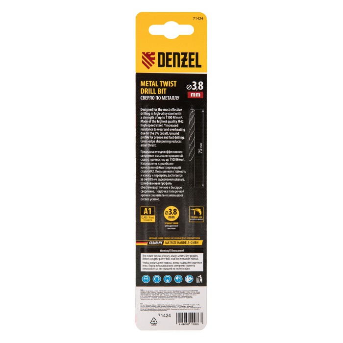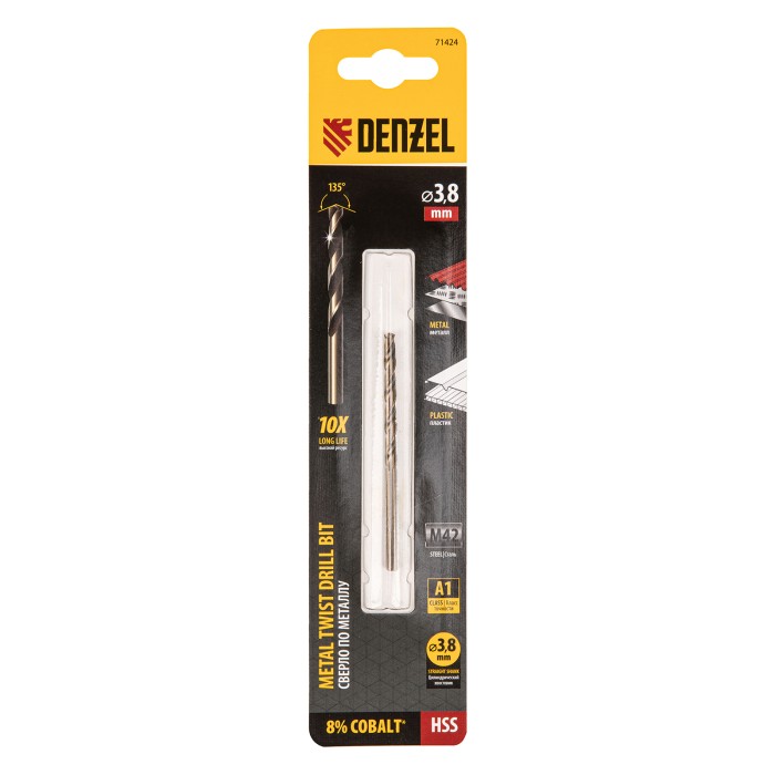 Кобальтовое сверло по металлу Denzel 71424 диаметром 3,8 мм, из стали HSS Co-8%, позволяет получать отверстия высокой точности в нержавеющей стали, цветных металлах, легированных и нелегированных сталях с пределом прочно...