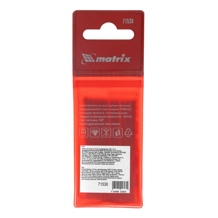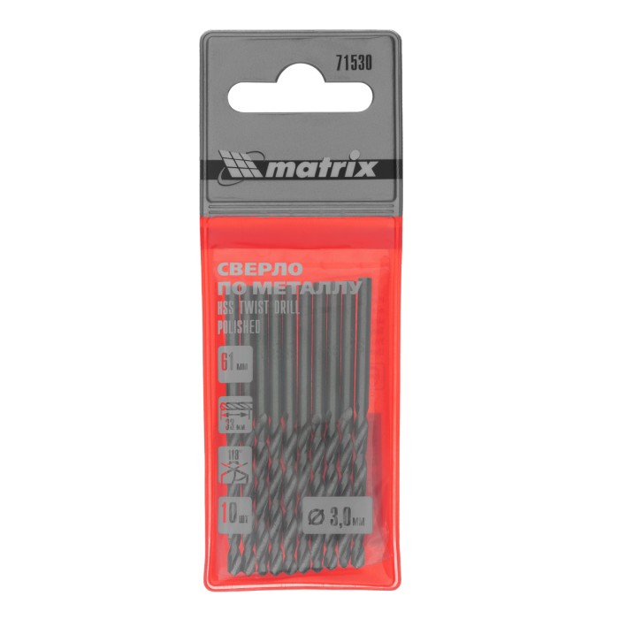 Полированное сверло по металлу Matrix 71530 из стали HSS, с цилиндрическим хвостовиком, 10 шт. в упаковке, используется для получения отверстий диаметром 3,0 мм. Угол заточки составляет 118 градусов, поэтому сверло оптим...