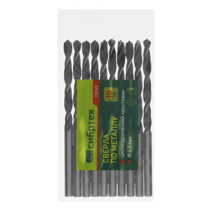 Сверло по металлу, 4.5 мм, быстрорежущая сталь, 10 шт, цилиндрический хвостовик Сибртех