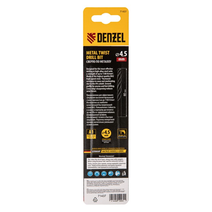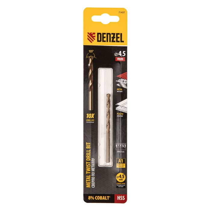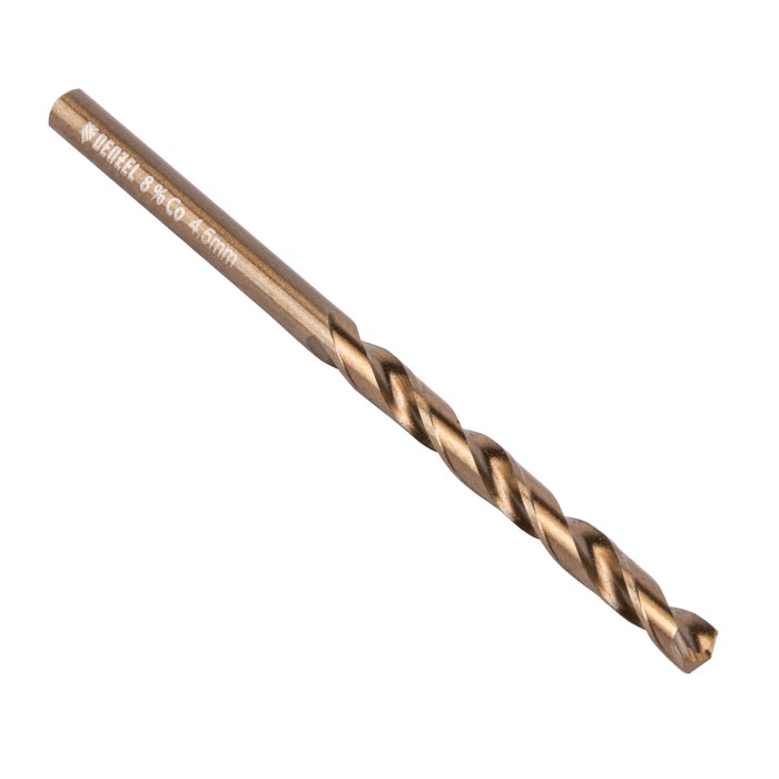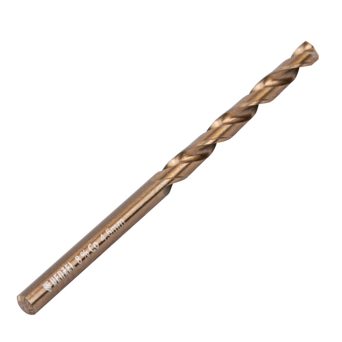 Кобальтовое сверло по металлу Denzel 71437 диаметром 4,5 мм, из стали HSS Co-8%, позволяет получать отверстия высокой точности в нержавеющей стали, цветных металлах, легированных и нелегированных сталях с пределом прочно...