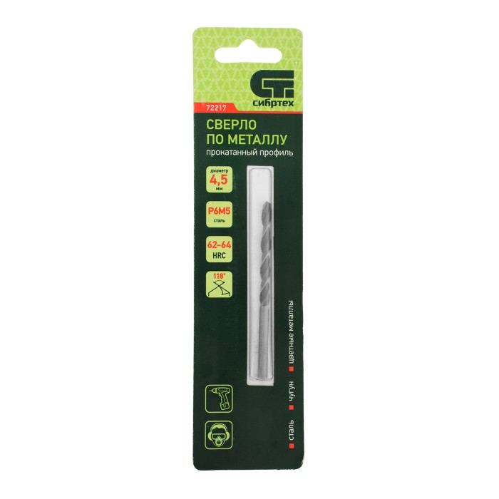 Сверло по металлу Сибртех 72217 диаметром 4,5 мм, имеет угол заточки 118°, оптимальный для получения отверстий в черных и тяжелых металлах, в том числе стали, чугуне и твердой бронзе. Отличается наиболее выгодной стоимос...