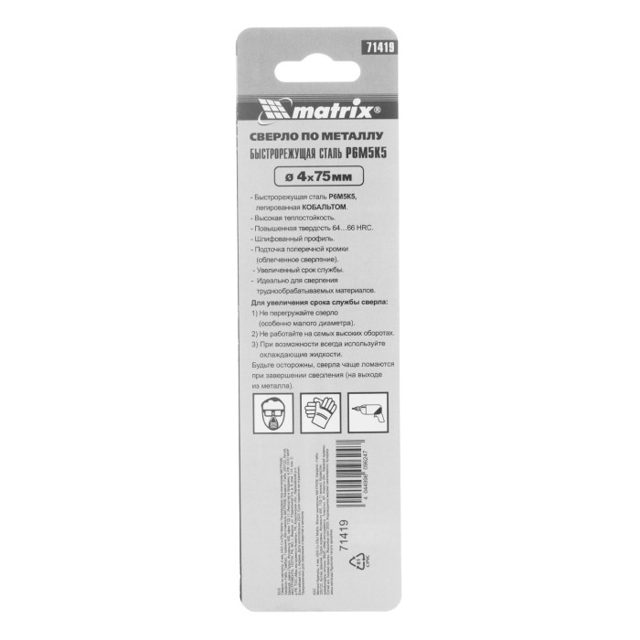 Сверло Matrix 71419 диаметром 4 мм, из стали HSS Co-5%, имеет угол заточки 135°, оптимальный для сверления легированных и цветных металлов. Подходит для профессионального использования на строительной площадке.ПреимуществаСтойкость к износу и перегреву — сверло выполнено методом вышлифовывания профиля из качественной быстрорежущей стали с 5% содержанием кобальта и имеет увеличенную сердцевину.Легкое засверливание — благодаря подточенной поперечной кромке предварительное накернивание (создание лунки) не требуется.Высокая скорость работы — поверхность сверла отполирована, что снижает трение и обеспечивает эффективный отвод стружки.Универсальность — цилиндрический хвостовик совместим со всеми типами патронов.
