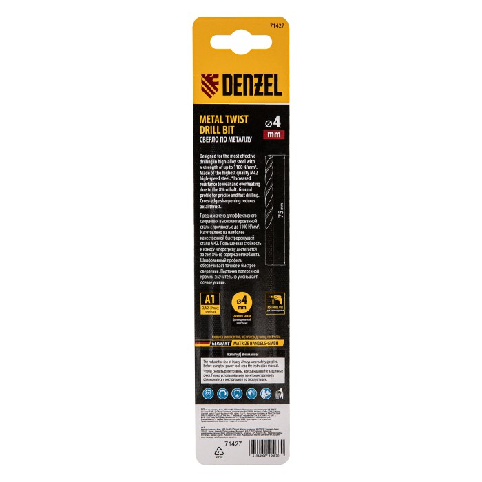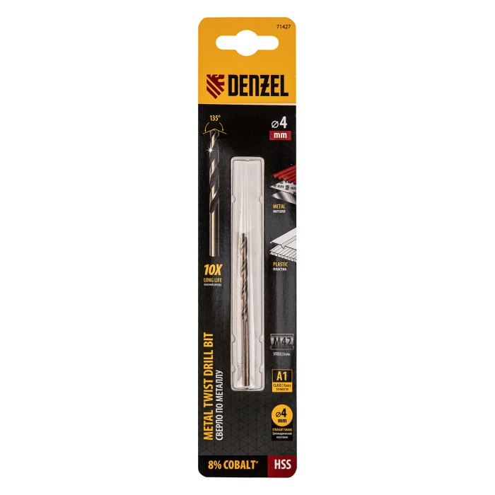 Кобальтовое сверло по металлу Denzel 71427 диаметром 4 мм, из стали HSS Co-8%, позволяет получать отверстия высокой точности в нержавеющей стали, цветных металлах, легированных и нелегированных сталях с пределом прочност...