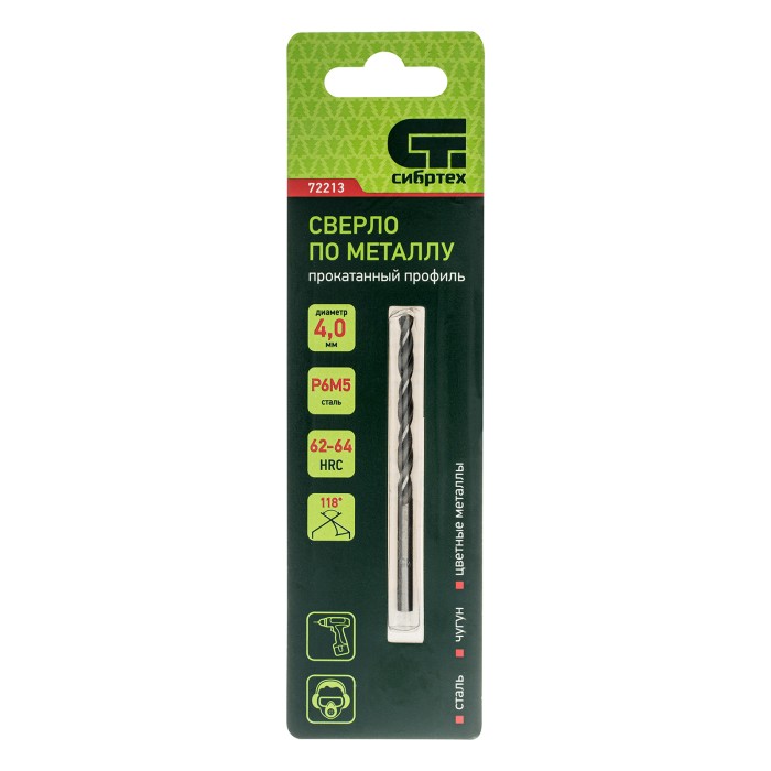 Сверло по металлу Сибртех 72213 диаметром 4,0 мм, имеет угол заточки 118°, оптимальный для получения отверстий в черных и тяжелых металлах, в том числе стали, чугуне и твердой бронзе. Отличается наиболее выгодной стоимостью по сравнению с другими моделями из стали P6M5. Используется для выполнения монтажно-сборочных работ, будет полезно в быту.ПреимуществаНадежность — сверло из быстрорежущей стали, легированной вольфрамом и молибденом, устойчиво к динамическим нагрузкам и перегреву.Высокий ресурс — режущие кромки твердостью 62-64 HRC долго держат заточку.Эффективная работа — благодаря полированной поверхности уменьшается трение сверла о стенки отверстия и улучшается отведение стружки.Универсальность — цилиндрический хвостовик подходит ко всем типам патронов.
