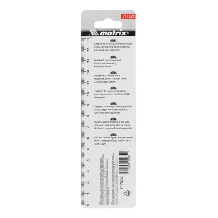 Сверло по металлу Matrix 717552 диаметром 5,5 мм, из стали HSS, с нитридтитановым покрытием и 6-гранным хвостовиком, предназначено для получения отверстий в черном металле, стали, чугуне и твердой бронзе. Устанавливается в патрон дрели.ПреимуществаПрочность — сверло изготовлено из быстрорежущей стали HSS.Высокий ресурс — нитридтитановое покрытие обеспечивает стойкость оснастки к коррозии и перегреву.Эффективная работа — за счет полированной поверхности сверло меньше подвержено трению и лучше отводит стружку.Надежная фиксация — шестигранный хвостовик не проворачивается в патроне дрели.