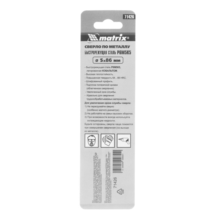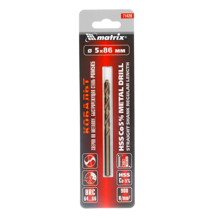 Сверло Matrix 71426 диаметром 5 мм, из стали HSS Co-5%, имеет угол заточки 135°, оптимальный для сверления легированных и цветных металлов. Подходит для профессионального использования на строительной площадке.ПреимуществаСтойкость к износу и перегреву — сверло выполнено методом вышлифовывания профиля из качественной быстрорежущей стали с 5% содержанием кобальта и имеет увеличенную сердцевину.Легкое засверливание — благодаря подточенной поперечной кромке предварительное накернивание (создание лунки) не требуется.Высокая скорость работы — поверхность сверла отполирована, что снижает трение и обеспечивает эффективный отвод стружки.Универсальность — цилиндрический хвостовик совместим со всеми типами патронов.