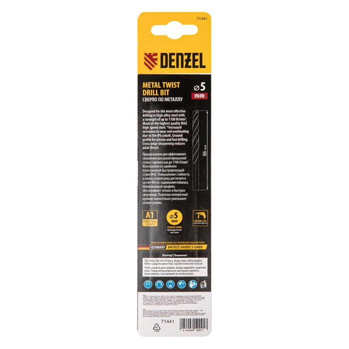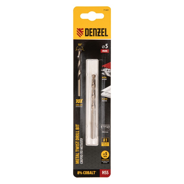 Кобальтовое сверло по металлу Denzel 71441 диаметром 5 мм, из стали HSS Co-8%, позволяет получать отверстия высокой точности в нержавеющей стали, цветных металлах, легированных и нелегированных сталях с пределом прочност...