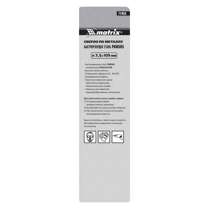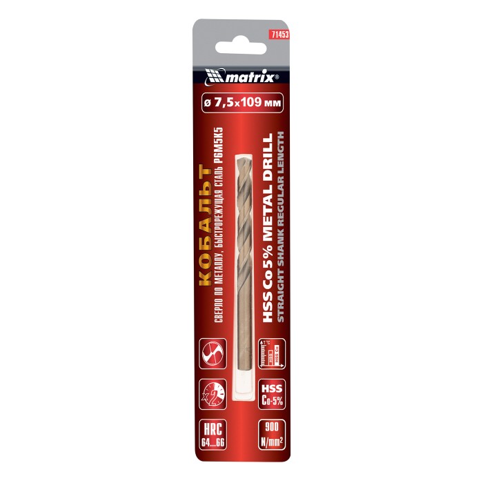 Сверло Matrix 71453 диаметром 7,5 мм, из стали HSS Co-5%, имеет угол заточки 135°, оптимальный для сверления легированных и цветных металлов. Подходит для профессионального использования на строительной площадке.Преимуще...