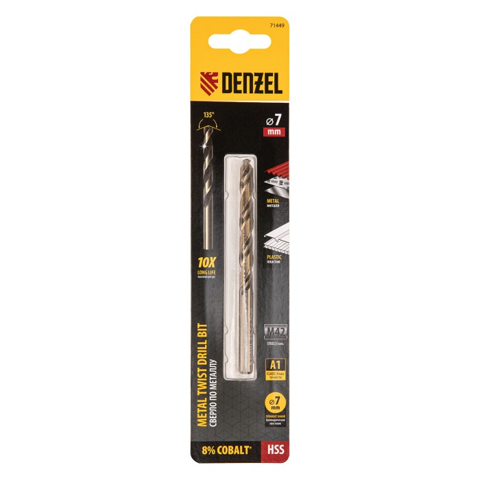 Кобальтовое сверло по металлу Denzel 71449 диаметром 7 мм, из стали HSS Co-8%, позволяет получать отверстия высокой точности в нержавеющей стали, цветных металлах, легированных и нелегированных сталях с пределом прочност...