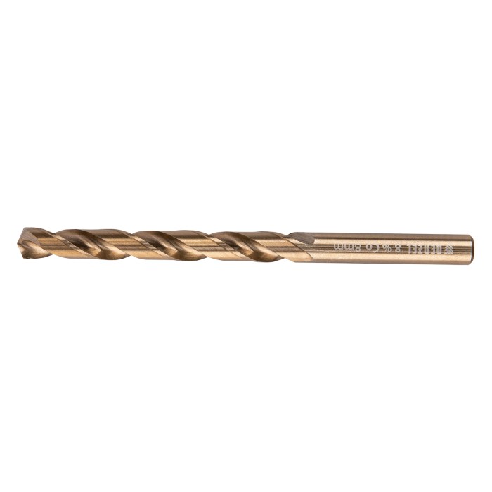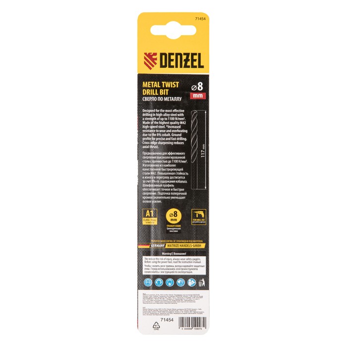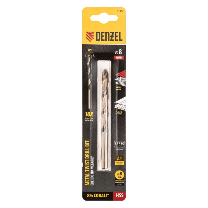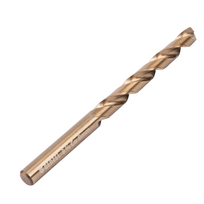 Кобальтовое сверло по металлу Denzel 71454 диаметром 8 мм, из стали HSS Co-8%, позволяет получать отверстия высокой точности в нержавеющей стали, цветных металлах, легированных и нелегированных сталях с пределом прочност...