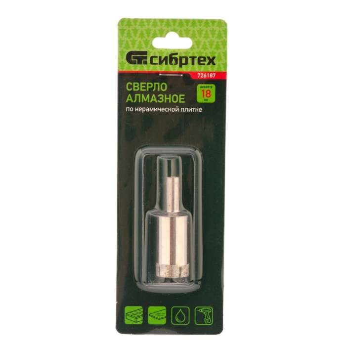 Сверло Сибртех 726187 размером 18 х 55 мм, с цилиндрическим хвостовиком, используется для получения ровных отверстий без сколов в стекле и керамической плитке. Устанавливается в патрон дрели или шуруповерта, работающих в диапазоне 350-700 об/мин. Во время работы рекомендуется применять водяное охлаждение — это существенно увеличит ресурс оснастки. Использование кондуктора (арт. 72830) позволяет точно позиционировать сверло и облегчает засверливание. Оснастка подходит для выполнения работ небольшого объема и рекомендована для использования в быту.ПреимуществаПрочность и долговечность — сверло изготовлено из среднеуглеродистой стали 45.Высокое качество выполняемых работ — рабочая часть с алмазным напылением обеспечивает быстрый и ровный рез.Устойчивость к образованию коррозии — на поверхность сверла нанесено защитное покрытие.