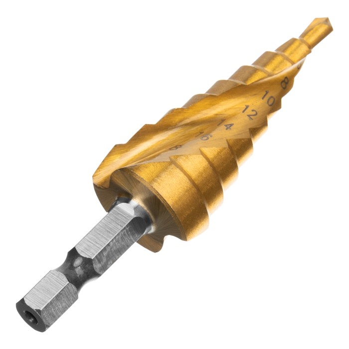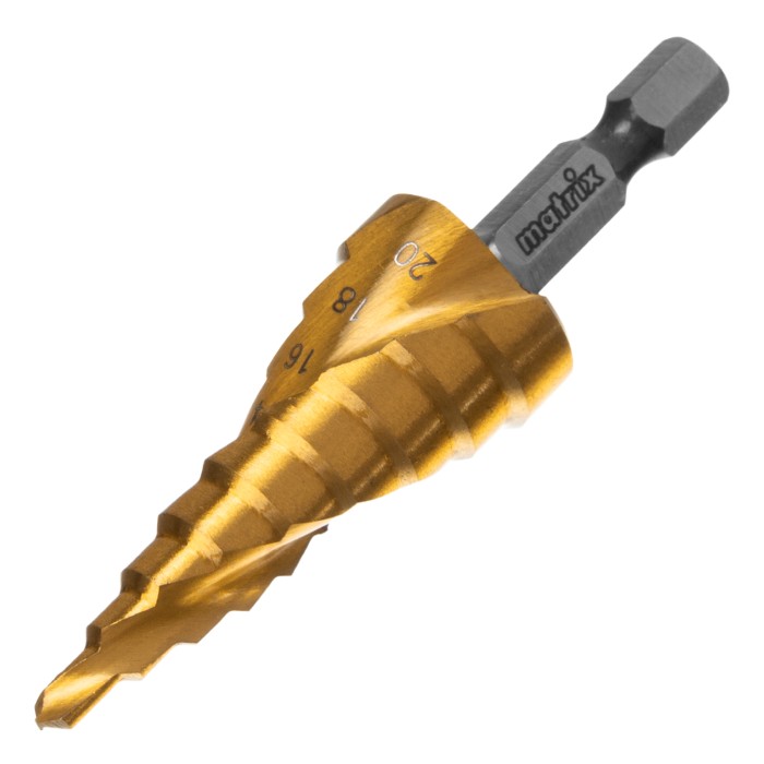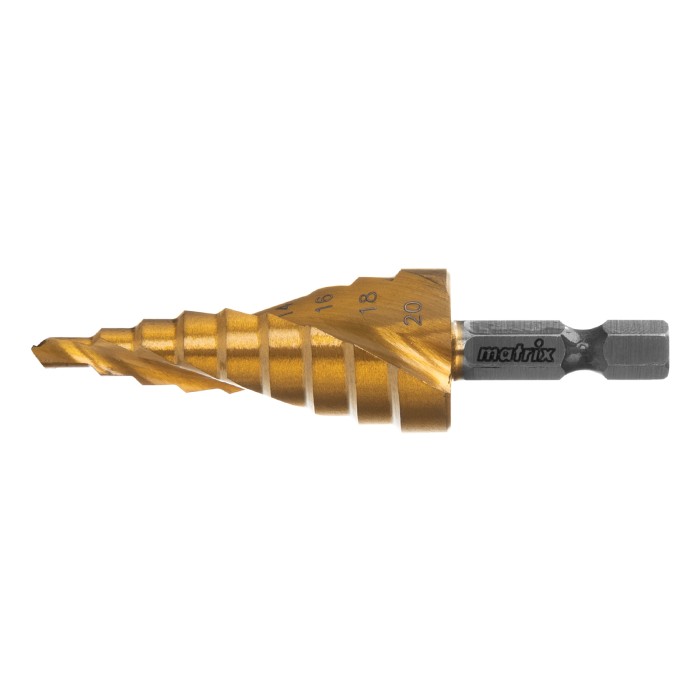 Сверло ступенчатое, 4-6-8-10-12-14-16-18-20 мм, HSS, спиральный профиль, шестигранный хвостовик Matrix