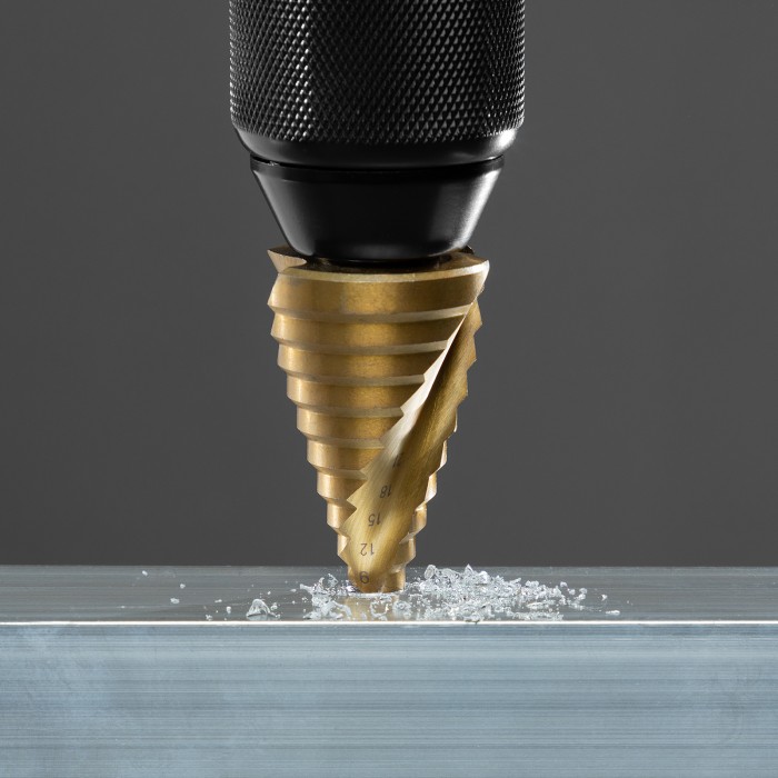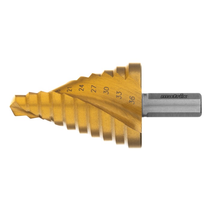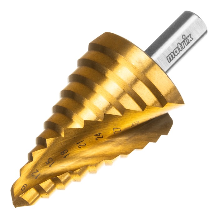 Сверло ступенчатое, 9-12-15-18-21-24-27-30-33-36 мм, HSS, спиральный профиль, трехгранный хвостовик Matrix