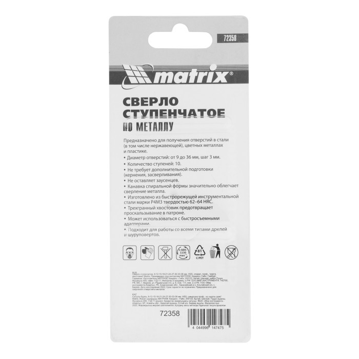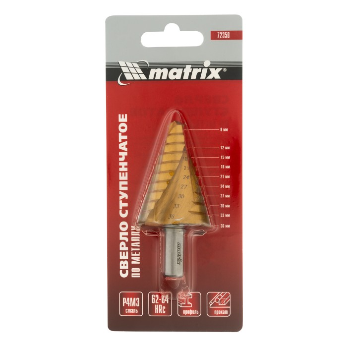 Ступенчатое сверло Matrix 72358 из стали HSS, со спиральным профилем и трехгранным хвостовиком, позволяет получать отверстия диаметром 9-12-15-18-21-24-27-30-33-36 мм в материалах толщиной до 5 мм: стали, цветных металлах, нержавейке и пластике. Благодаря плавному ступенчатому переходу и возможности сразу снять фаску отверстие получается аккуратным и имеет ровные края.ПреимуществаНадежность — сверло изготовлено из прочной быстрорежущей стали HSS.Решение широкого спектра задач — оснастка заменяет целый комплект сверл.Высокий ресурс — нитридтитановое покрытие предотвращает преждевременный износ и образование коррозии.Удобная работа — предварительная подготовка поверхности (кернение или засверливание) не требуется.Эффективность — благодаря спиральному профилю оснастка легко сверлит металл.Надежная фиксация — трехгранный хвостовик не проворачивается в патроне дрели.