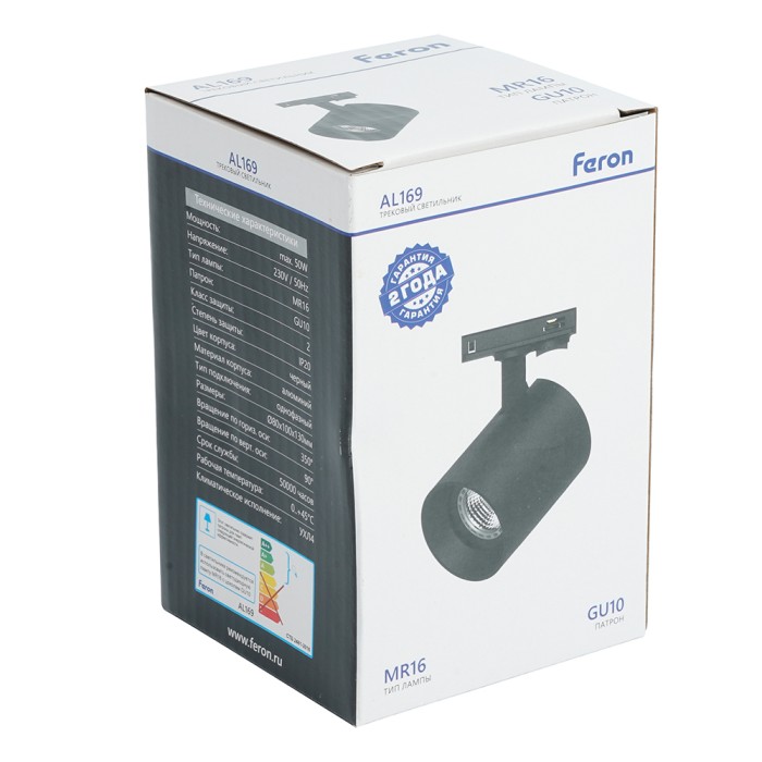 Светильники трековые на шинопровод GU10, однофазный (ИВО) FERON AL169, 50W, 230V, цвет черный, корпус алюминий, вращение →350°/↓90°, 100*80*130 мм