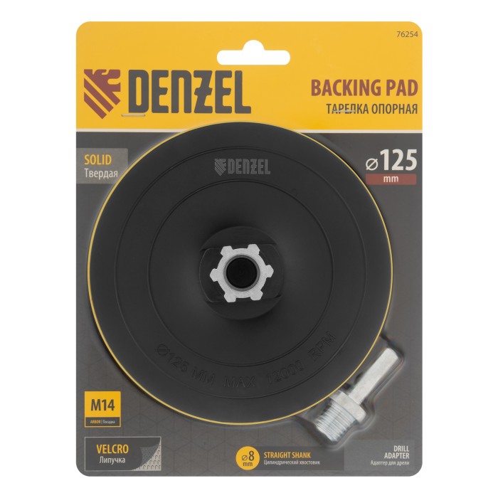Тарелка опорная Denzel 76254 диаметром 125 мм, с липучкой и адаптером с М14 на d8, твердая, устанавливается на дрель или углошлифовальную машину (УШМ). Используется для крепления абразивных или полировальных кругов на во...