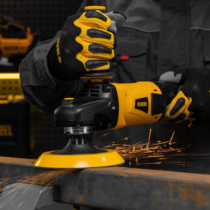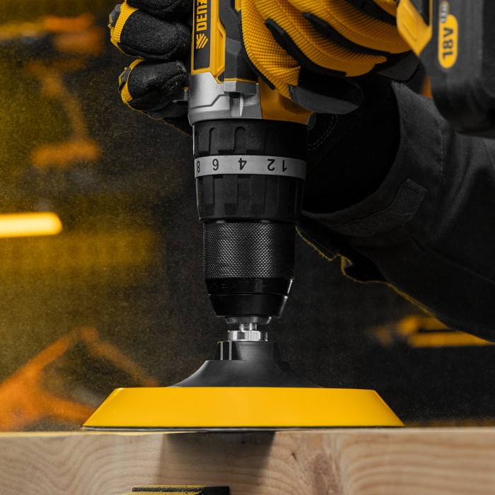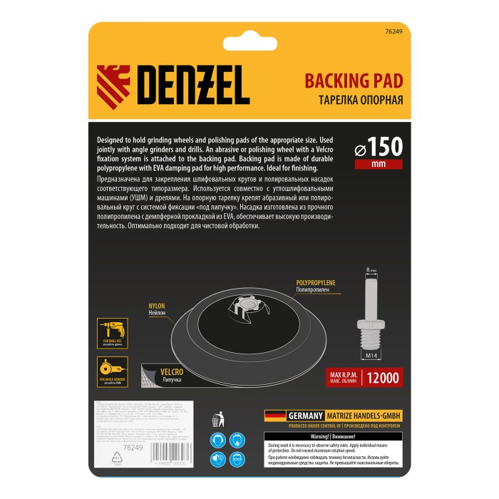 Тарелка опорная Denzel 76249 диаметром 150 мм, с липучкой и адаптером с М14 на d8, мягкая, устанавливается на дрель или углошлифовальную машину (УШМ). Используется для крепления абразивных или полировальных кругов на ворсовой основе, позволяет подготовить поверхность для дальнейшей обработки или придать ей финишную гладкость.ПреимуществаЭффективная работа — насадка-тарелка оптимально подходит для финишного шлифования и полировальных работ.Долговечность — опорная тарелка выполнена из нейлона с демпферной вставкой из полиуретана, крепежная гайка и адаптер защищены от коррозии.Простая подготовка к работе — полировальный или абразивный круг с креплением velcro быстро крепится и снимается благодаря липучке.Возможность установки на дрель — адаптер-переходник с М14 на d8 входит в комплект поставки.Малый вес 230 г — тарелка не утяжеляет инструмент.