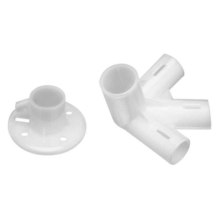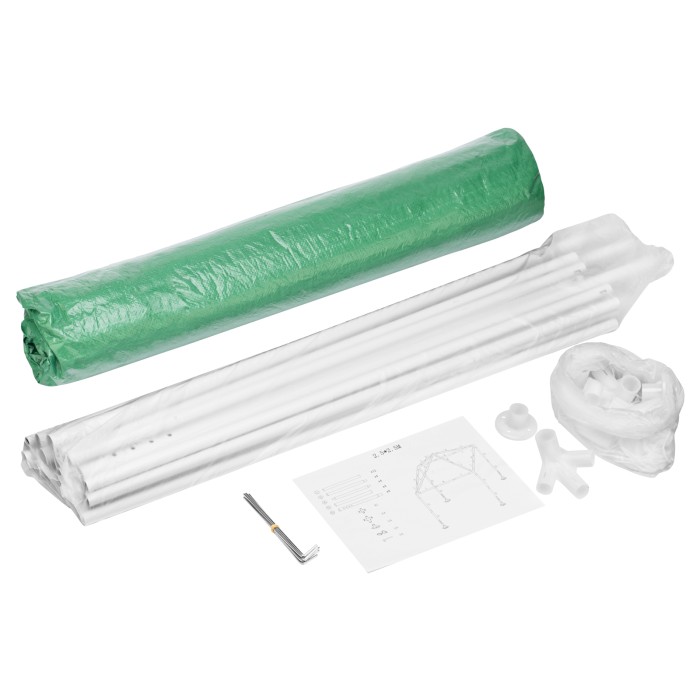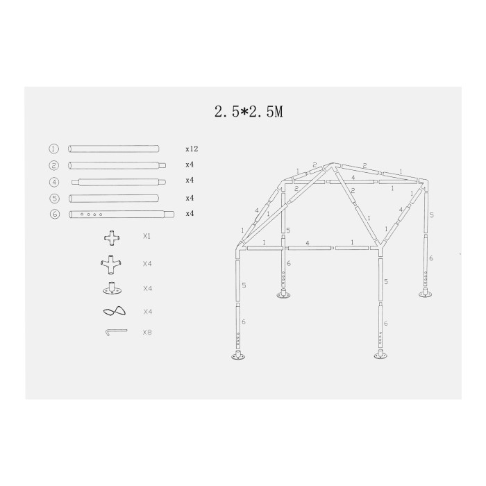 Опоры стоек - 4 штБоковое угловое крепление трубок - 4 штЦентральное угловое крепление трубок - 1 штТрубка1 - 12 штТрубка2 - 4 штТрубка3 - 4 штТрубка4 - 4 штТрубка5 - 4 штКолышки - 8штВеревка, длина 3000 мм - 4 штТент с москитной сеткой - 1 шт