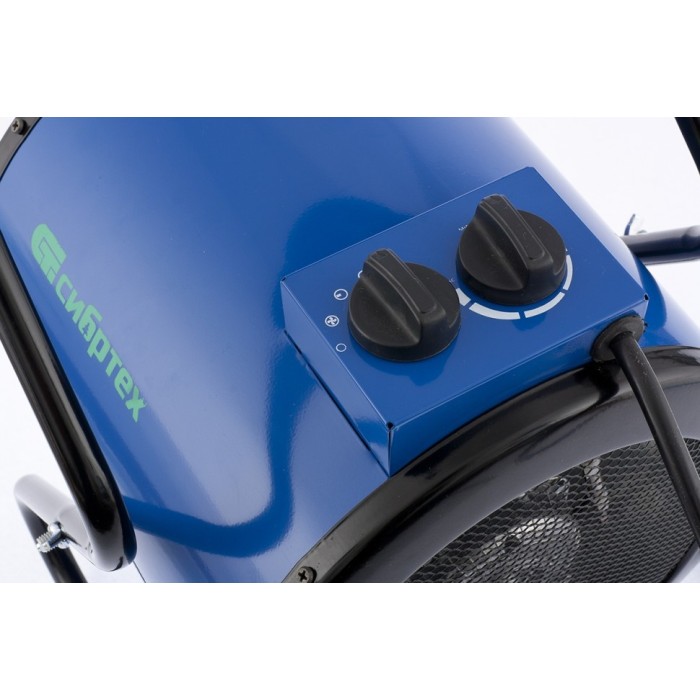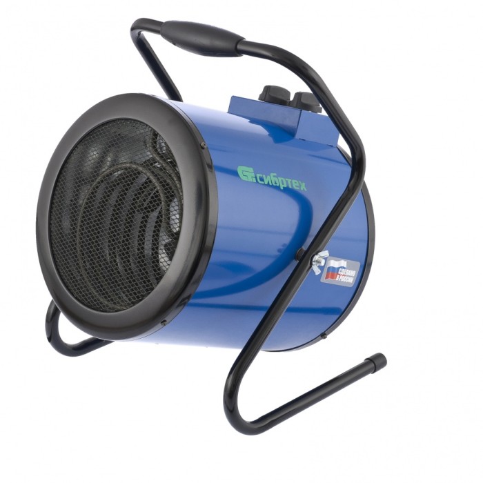 Тепловая пушка (тепловентилятор) Сибртех ТВ-5 96434 работает от сети 220 В и имеет 3 режима: вентилятор и нагрев 3000/4500 Вт. Обеспечивает обогрев помещений, вентиляцию и дистанционное просушивание предметов и поверхностей. Имеет производительность 420 м3/ч и может использоваться в общественных, производственных и вспомогательных помещениях закрытого типа, а также на строительных объектах.ПреимуществаНадежность и долговечность — нагревательными элементами являются ТЭНы из нержавеющей стали, двойные стенки стального корпуса защищают внутренние элементы от повреждений, решетки препятствуют попаданию посторонних предметов.Максимальный комфорт — можно выбрать оптимальную мощность нагрева: 3000 и 4500 Вт.Автономность — встроенный термостат поддерживает температуру воздуха в помещении на заданном уровне.Термозащита — в случае перегрева корпуса ТЭНы отключаются для предотвращения поломки пушки, автоматическое включение происходит через 1-2 минуты.Эффективность — цилиндрический корпус формирует направленный поток горячего воздуха, что сокращает время на обогрев помещений и просушивание предметов и поверхностей.Автоматическое охлаждение ТЭНов при неправильном отключении — производитель предусмотрел функцию дополнительного обдува.Продуманная конструкция — ручка-фиксатор позволяет установить корпус под определенным углом, что удобно для просушивания определенного участка поверхности.Простой уход — достаточно регулярно очищать решетки от пыли.Устойчивость — опорные ножки не позволяют тепловой пушке опрокидываться.Удобная транспортировка — у пушки имеется удобная обрезиненная рукоятка.Гарантия 3 года — надежность техники подтверждена производителем.