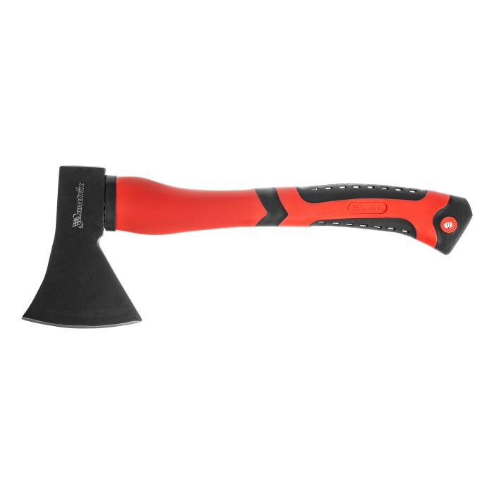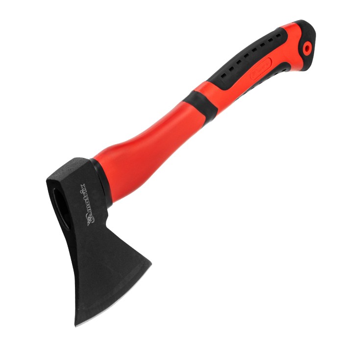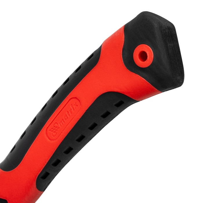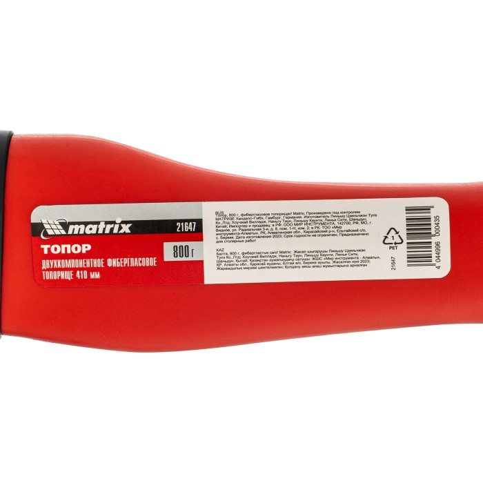 Топор Matrix 21647 с рабочей частью весом 800 г и фибергласовым топорищем предназначен для рубки, тесания и колки твердой или мягкой древесины. Будет полезен на дачном и сельскохозяйственном участке для заготовки дров, рубки кустов, сучьев, а также выполнения других работ. Топор оптимален для полупрофессионального применения.ПреимуществаПрочность и коррозионная стойкость — полотно из стали 45 покрыто защитной краской, лезвие закалено до твердости 50 HRC.Качественное топорище — фиберглас устойчив к негативным воздействиям окружающей среды и отличается высокой механической прочностью.Надежный хват — благодаря небольшому изгибу и прорезиненным вставкам топорище не выскальзывает из рук.Комфортная работа — фибергласовое топорище гасит вибрации, что в сочетании с малым весом полотна 800 г позволяет уменьшить нагрузку на руки.Дополнительные возможности — отверстие в топорище позволяет организовать подвесное хранение. Компактность — топор с рукояткой длиной 390 мм легко помещается в переноску или рюкзак.