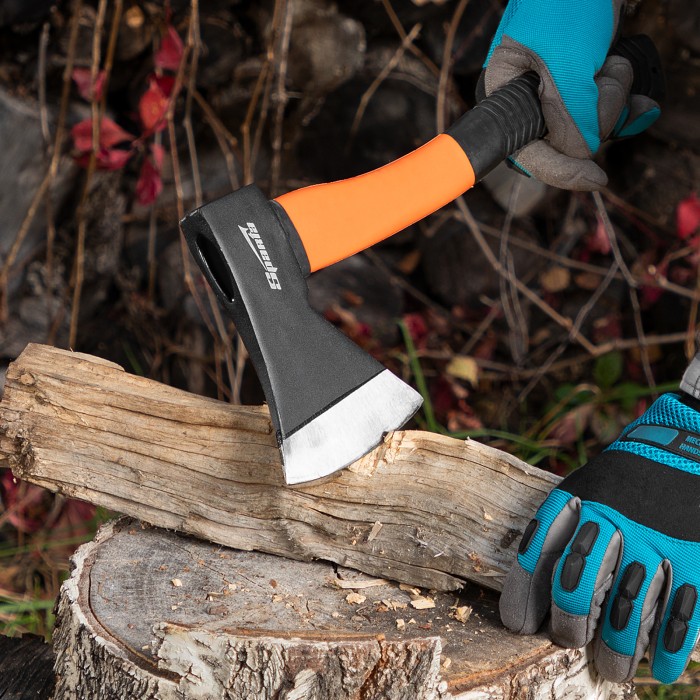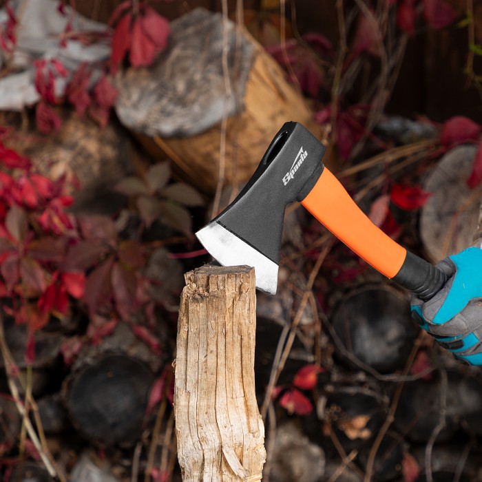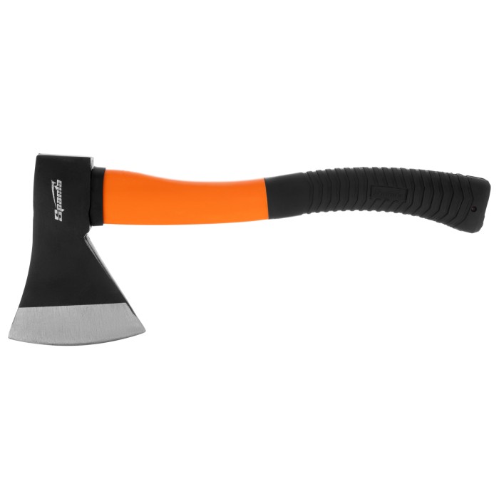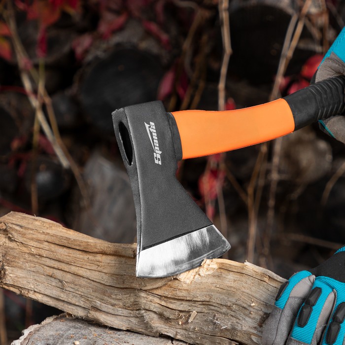Топор Sparta 21639 с рабочей частью весом 800 г и фибергласовым топорищем рассчитан на рубку, тесание и колку древесины любых пород. Рабочая кромка, заточенная под углом 20-30°, легко врезается в древесину. Инструмент пригодится для бытовых работ: заготовки дров, рубки сучьев, небольших бревен, пеньков и т.д. ПреимуществаПрочность и высокий ресурс — полотно выполнено из стали 45 и закалено до твердости 35-40 HRC на высоту до 25 мм от режущей кромки.Долговечность — фибергласовая рукоятка не разрушается под воздействием окружающей среды.Эргономичность — изогнутая обрезиненная рукоятка не выскальзывает из рук.Легкий вес полотна 800 г — длительная работа топором не вызывает дискомфорт.Компактность — благодаря небольшой длине рукоятки 390 мм инструмент легко поместится в переноску для инструмента или рюкзак.