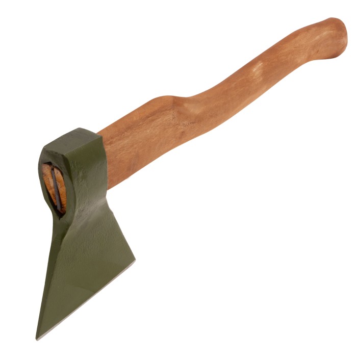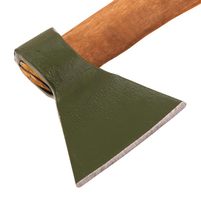 Топор изготовлен из 45 стали .Топорище инструмента изготовлена из древесины твердых лиственных пород.Вес с топорищем 1550 г.Общая длина в сборе составляет 500 мм.