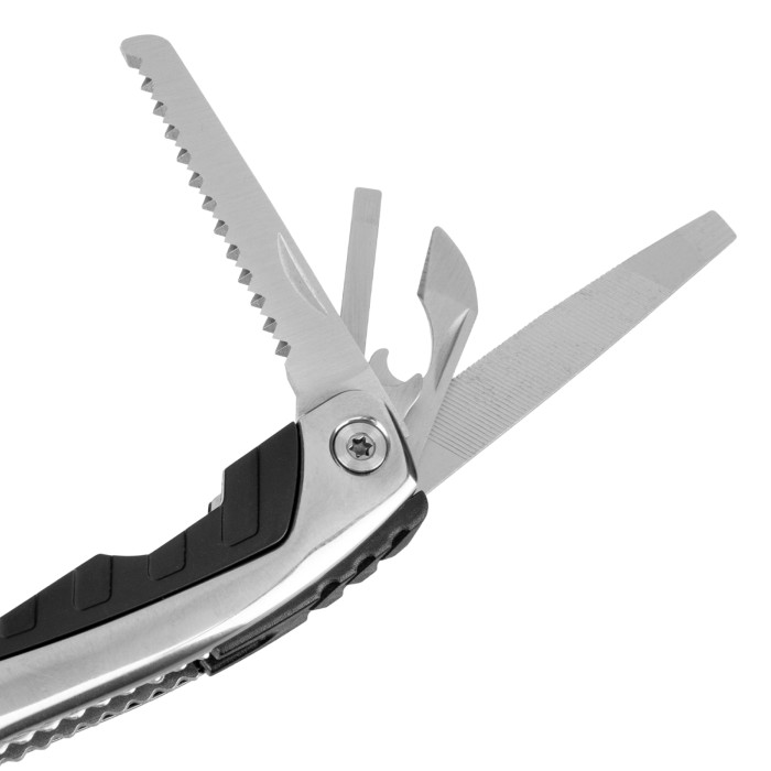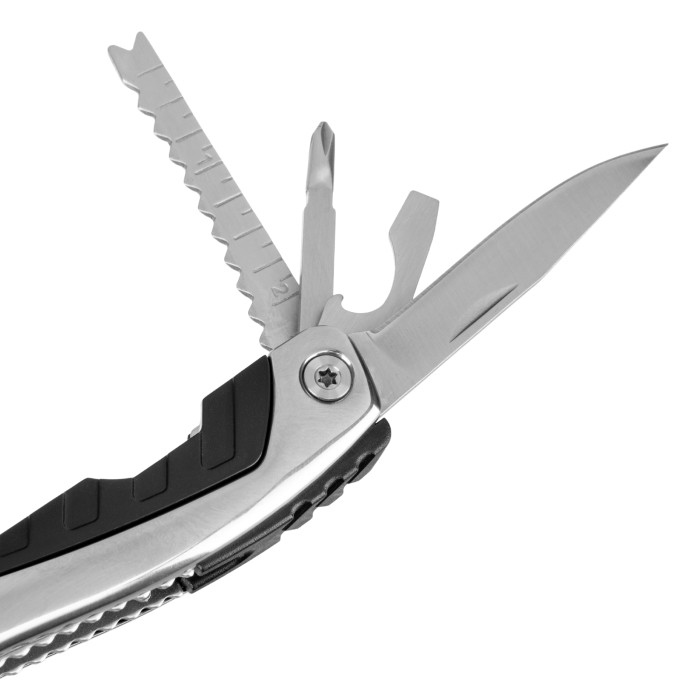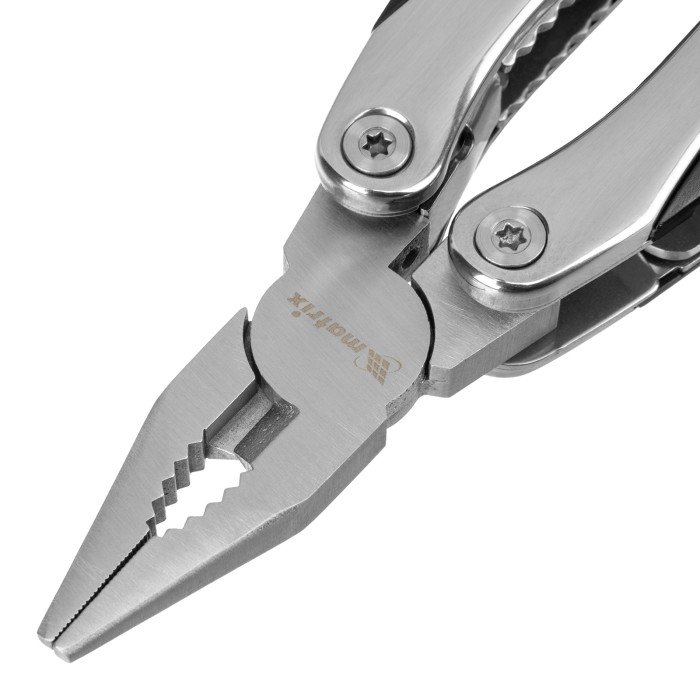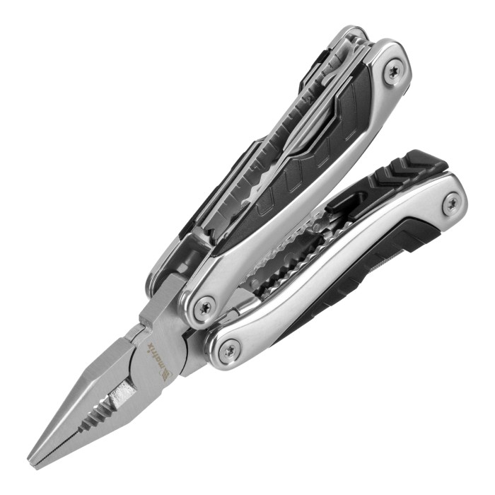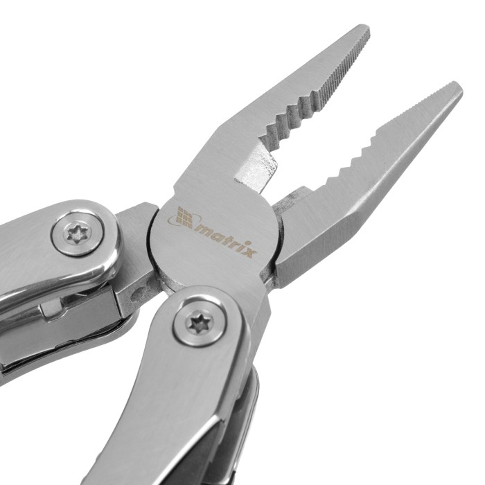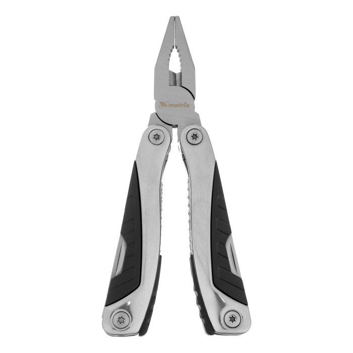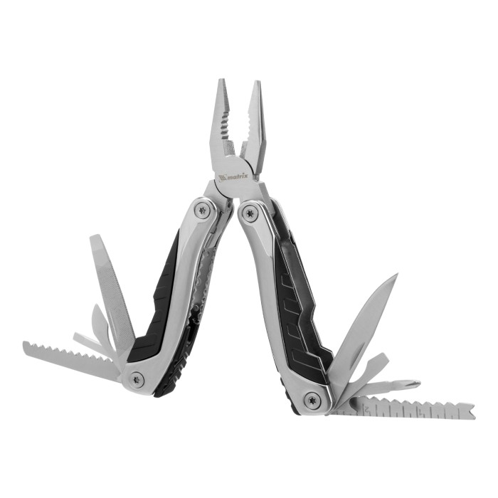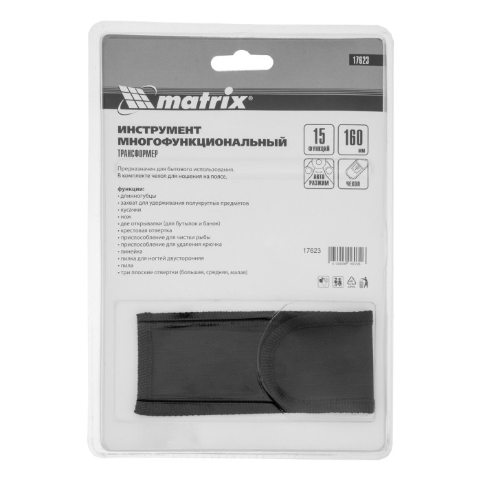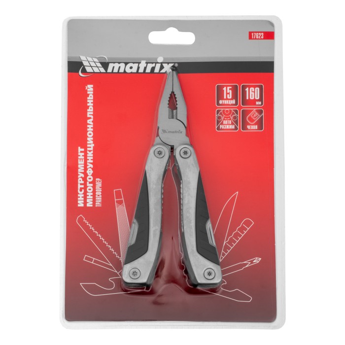 Трансформер Matrix 17623 длиной 160 мм имеет 15 функций и авторазжим, поставляется с чехлом. Может использоваться в гараже, т.к. включает длинногубцы с кусачками и захватом полукруглых предметов, а также отвертки и линейку. Трансформер пригодится в походе, на рыбалке или охоте, поскольку имеет в составе нож, пилу, открывалку, консервный нож, инструменты для чистки рыбы и удаления крючка. Благодаря пилке для ногтей мультитул будет полезен в быту.ПреимуществаДолговечность — нож и другие элементы изготовлены из прочной стали.Комфортное использование длинногубцев — инструмент имеет функцию авторазжима.Удобное хранение и транспортировка — трансформер комплектуется чехлом.